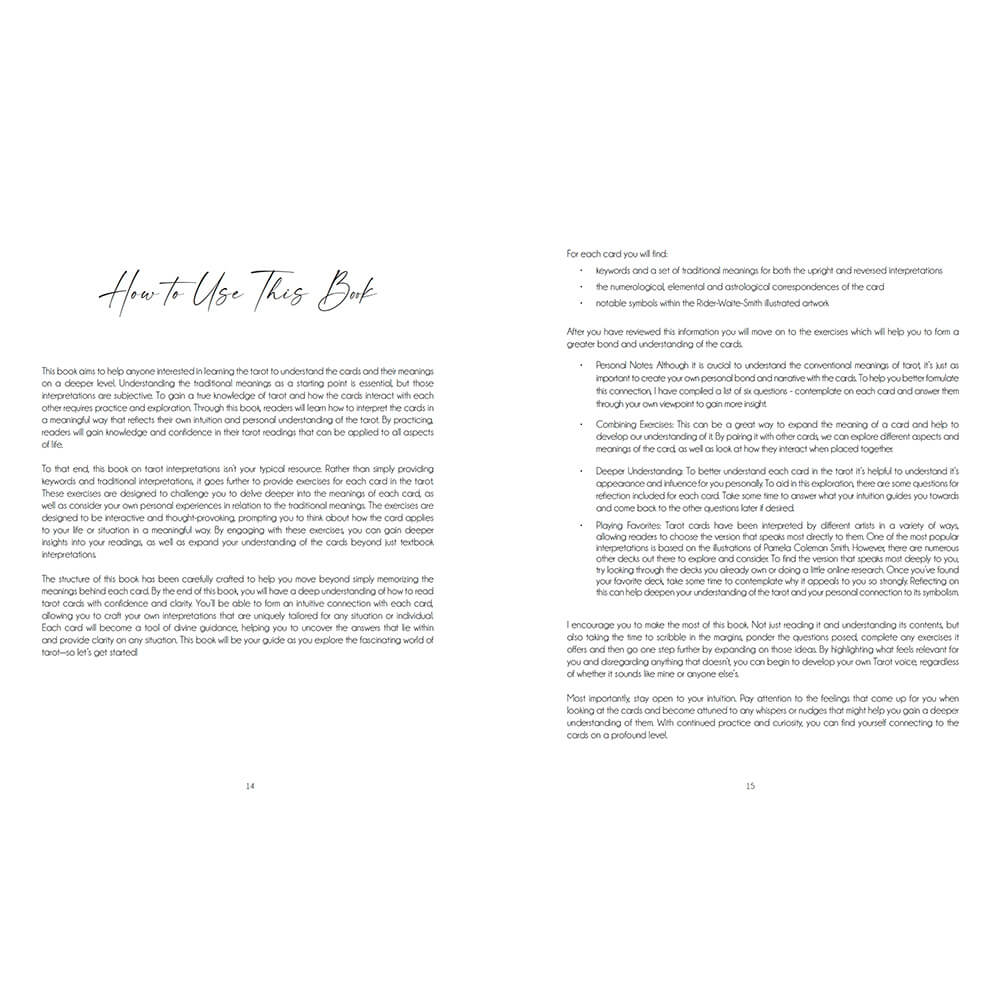 DECODING THE CARDS isn’t your typical resource. Rather than simply providing keywords and traditional interpretations, it goes further to provide exercises for each card in the tarot. These exercises are designed to challenge you to delve deeper into the meanings of each card, as well as consider your own personal experiences in relation to the traditional meanings. The exercises are designed to be interactive and thought-provoking, prompting you to think about how the card applies to your life or situation in a meaningful way. By engaging with these exercises, you can gain deeper insights into your readings, as well as expand your understanding of the cards beyond just textbook interpretations.